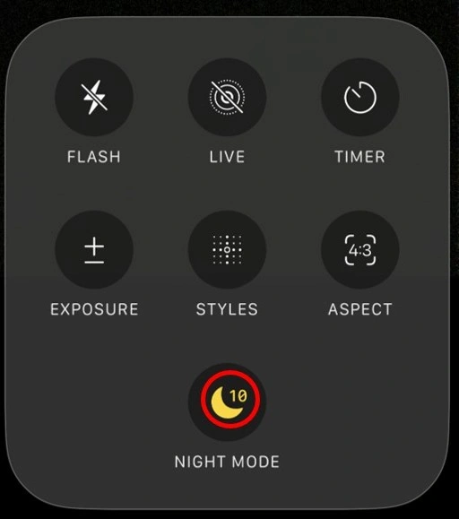 Open Camera → “PHOTO”, then tap the “NIGHT MODE” icon until you see “10” displayed.