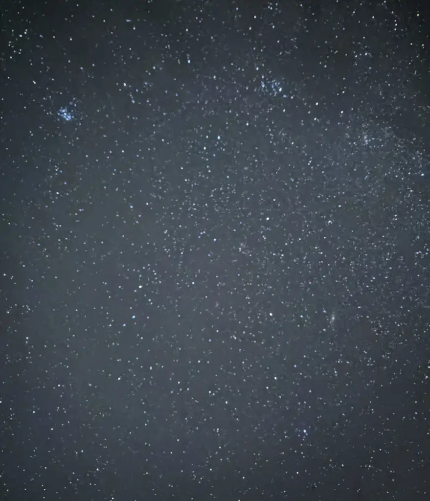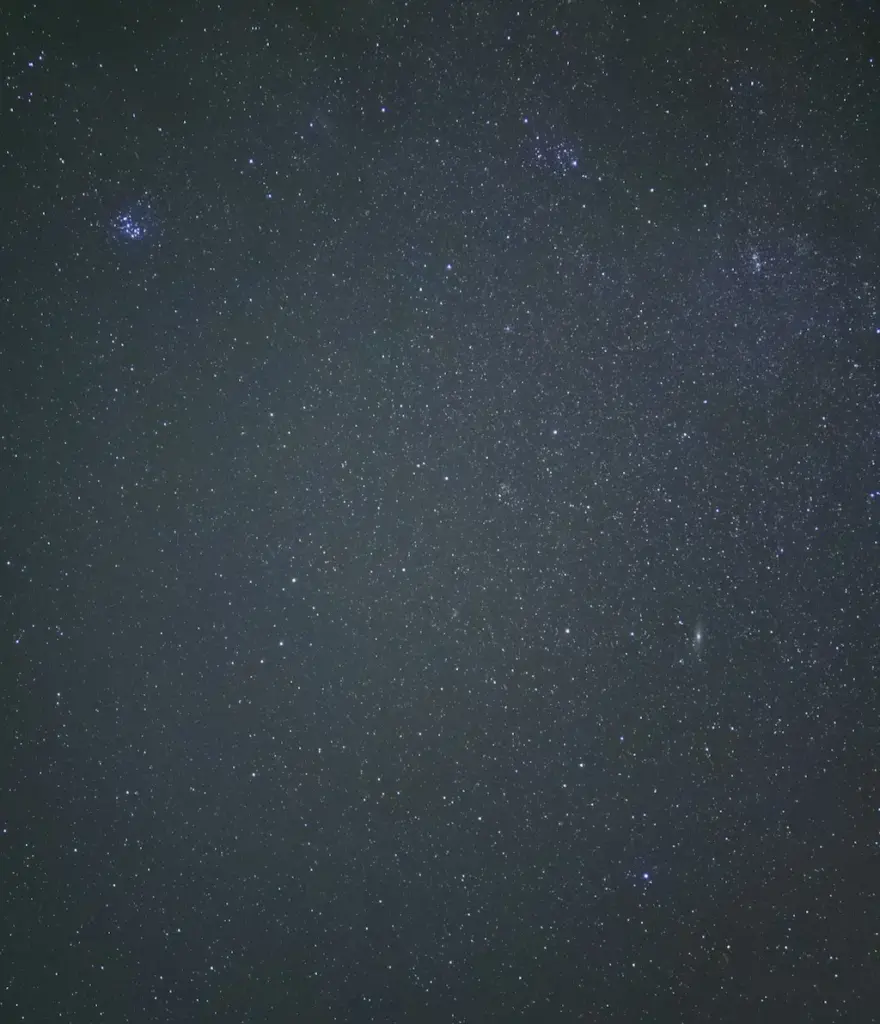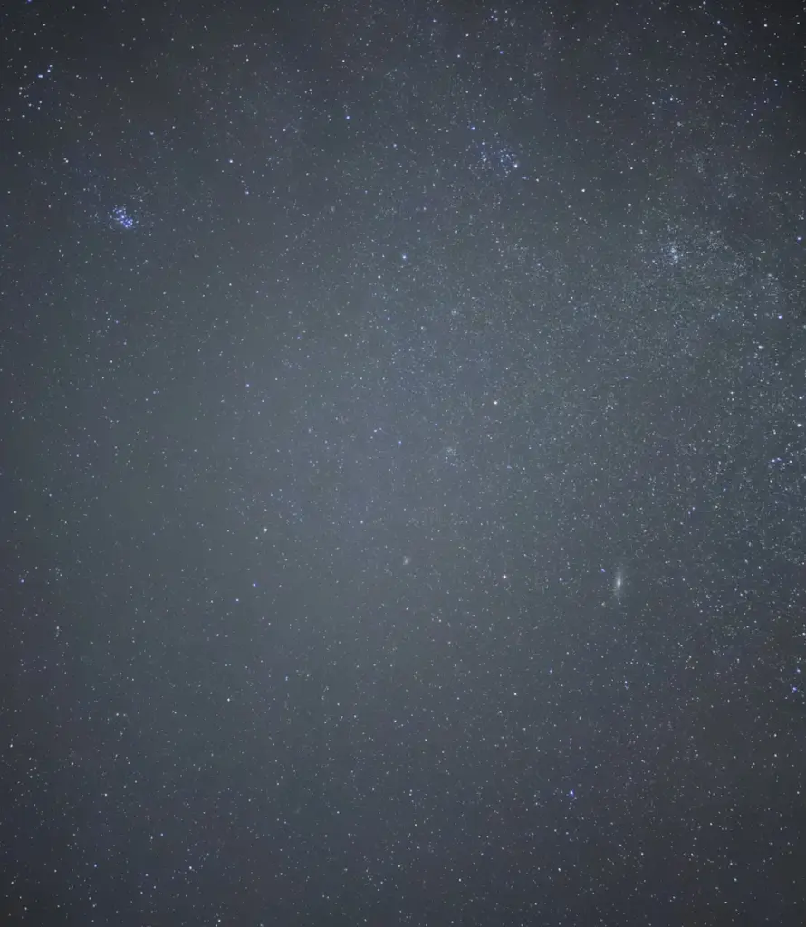 iPhone 17 Proでは、銀河の淡い光まで見事に捉えています。ブレを極限まで抑えれば、ここまで鮮明な写真を撮ることが可能です。一方、iPhone 17ではアンドロメダ銀河もその周辺の星々も、完全にぼやけてしまっています。