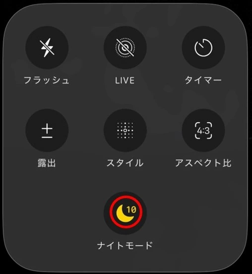 「ナイトモード」を何度かタップすると、月の右上に“10”と表示されます。このとき、画面上部には『ナイトモード(最大)』と一瞬だけ表示されます。