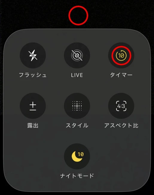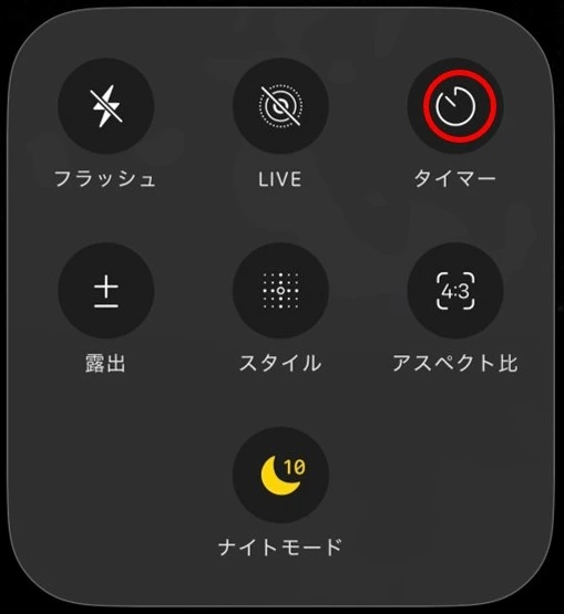 タイマーボタンをタップして、撮影開始までの時間を「10秒」にセットします。(シャッターを押した振動を収めるためです)